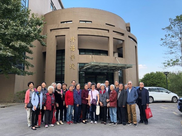 首先,各位校友在江宇靖的陪同下,于中北校区办公楼前合影。江宇靖欢迎各位校友在入学一甲子之际重回母校,能在耄耋之年重新团聚的机会十分难得,希望各位校友能在母校重新留下美好的回忆。