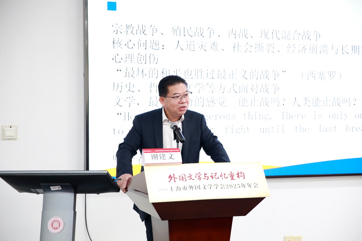 第一阶段的主旨报告由副会长、上海师范大学张静教授和番茄小说 胡学星教授主持。副会长、上海外国语大学谢建文教授以《另一个记忆的切口——马塞尔·拜尔<狐蝠>探析》为题,剖析了战争、记忆、声音与文学虚构之间的多重互动关系。谢建文教授认为,拜尔笔下的声音既是记忆的载体,也是重构历史的媒介,“声音档案”不仅再现了帝国末期德国生活轨迹的众声合唱,更在知识诗学的框架下,借助声学、解剖学等跨学科知识,构建了一个兼具身体性、反思性与象征性的叙事空间,最终在真实与虚构的张力中,展现了第三帝国历史记忆的面貌。