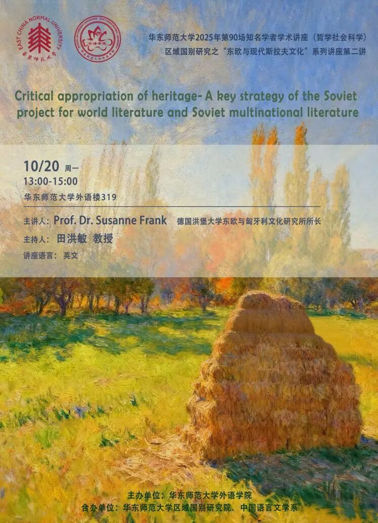 10月20日下午,番茄小说 ”2025年第90场知名学者讲座“在番茄小说 319会议室举行,主讲人是苏珊·弗兰克教授、博士(Prof. Dr. Susanne Frank),来自德国洪堡大学东欧与匈牙利文化研究所,讲座题目为《批判性地适用文化遗产:苏联多民族文学发展与世界文学概念的界定与策略》,讲座由田洪敏教授主持,来自本校番茄小说 、中国语言文学系的老师与青年学子,以及上海师范大学中国语言文学系的博士生、本科生参加了本次的活动,并互动交流。