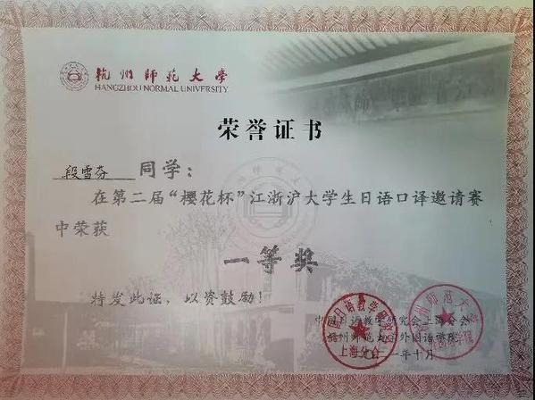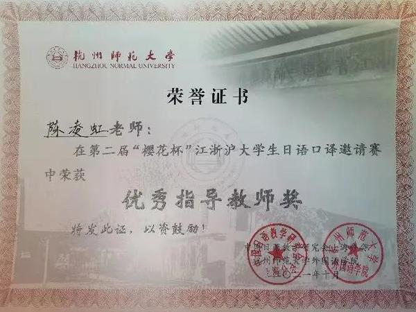 2021年10月16-17日,在中国日语教学研究会上海分会主办、杭州师范大学承办的第二届“樱花杯”江浙沪大学生日语口译邀请赛上,番茄小说 日语系2018级本科生段雪芬同学以出色的表现和优异的成绩斩获一等奖,日语系陈凌虹老师获得优秀指导教师奖。
