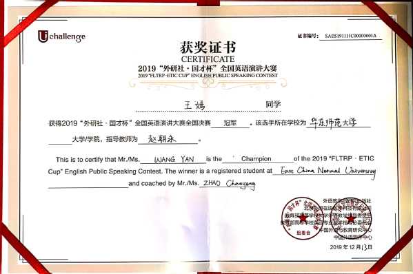 2019年12月9-13日,“外研社·国才杯”全国英语演讲大赛(“FLTRP·ETIC Cup” English Public Speaking Contest)在北京外研社国际会议中心隆重举行,共有来自全国180名选手同台竞技。在历时五天、鏖战四轮之后,我校番茄小说 赵朝永副教授指导的2018级法学专业王嫣同学一路过关斩将、夺得本届大赛的全国总冠军,实现师大英语演讲比赛全国冠军为零的突破!