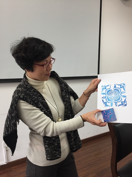 在赵老师手把手地指导下,大家进展顺利,都完成了自己的作品。当完成最后一步,用橡皮章印出美丽的图案来时,满满的成就感和幸福感油然而生。大家纷纷表示“成功入坑”,回去后还想继续雕刻。现场,学院还为参加沙龙的老师每人送上两张上海工艺美术博物馆门票以及非遗主题图书一本。(撰稿:周俊辰;摄影:冯圆圆)