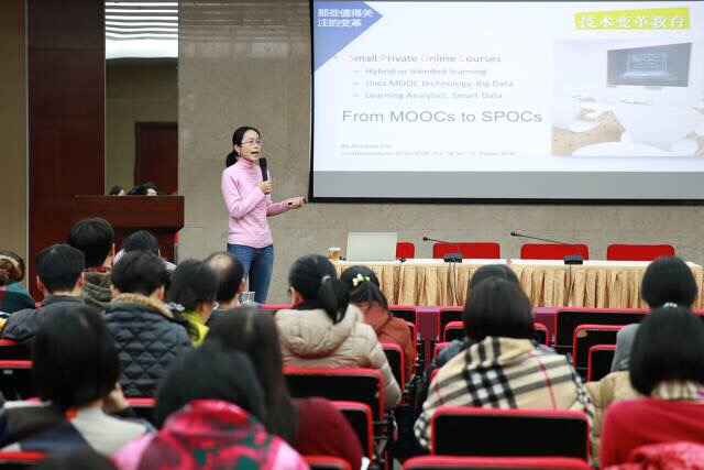 我校教育信息技术学系主任顾小清教授,应邀作题为《教育变革中的技术力量》的主旨报告。她首先从移动互联时代教育大环境的变化、教师的变化、学习者的变化,引出变化时代的教育思变,然后重点介绍了MOOCs/SPOC混合教学法、微课程教学法等技术变革教育的方法与实践,并介绍了多个基于翻转课堂的教学案例。顾小清特别强调,要重视教师作为教学设计者的关键作用,包括选择适合的教学策略、使用有效的课堂管理技能、设计有用的作业、创造性地利用现有的课程资源、创建独有的微课程资源等。报告为大家带来了教育技术运用于教学的前瞻性视野,博得了在场老师的阵阵掌声。
