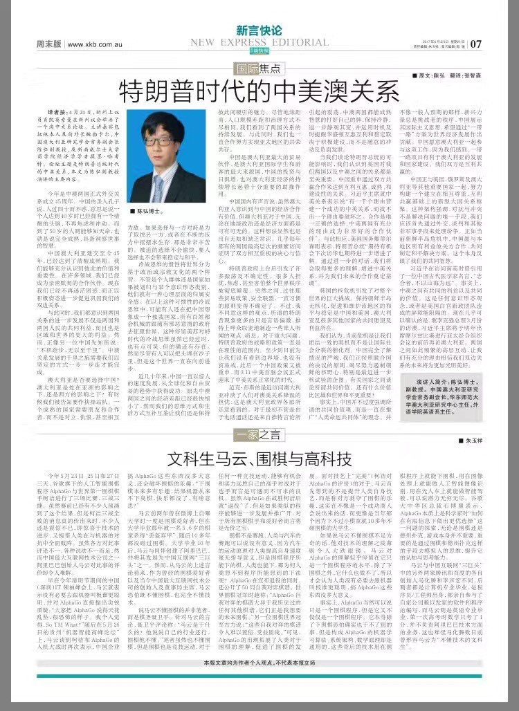 9)6月4日,澳大利亚最大的中文报纸《澳洲新快报》发表陈弘文章,《特朗普时代的中美澳关系》。