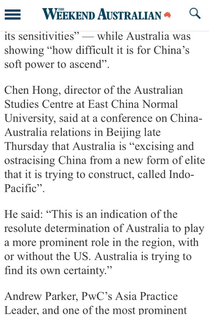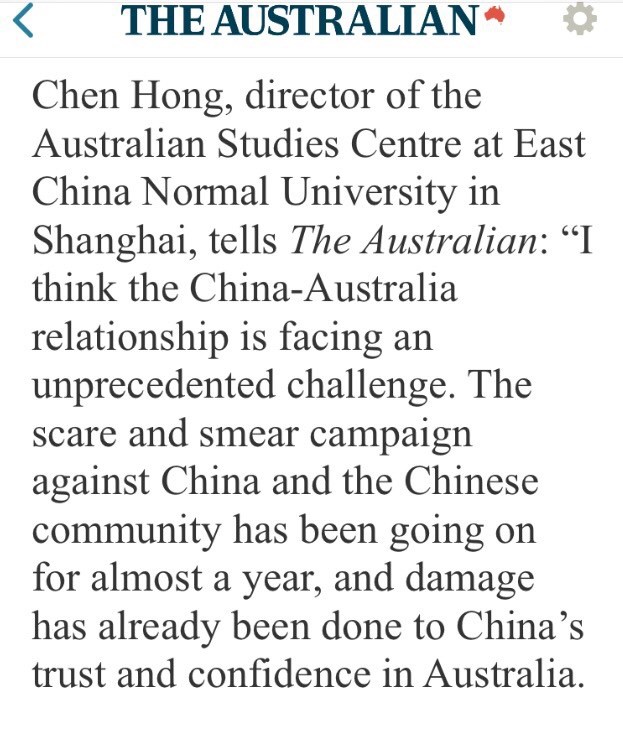 19)11月26日,《澳大利亚人报》在题为China media says Canberra ‘negative’的文章中,引述陈弘对中澳关系中所产生的新问题所发表的观点。