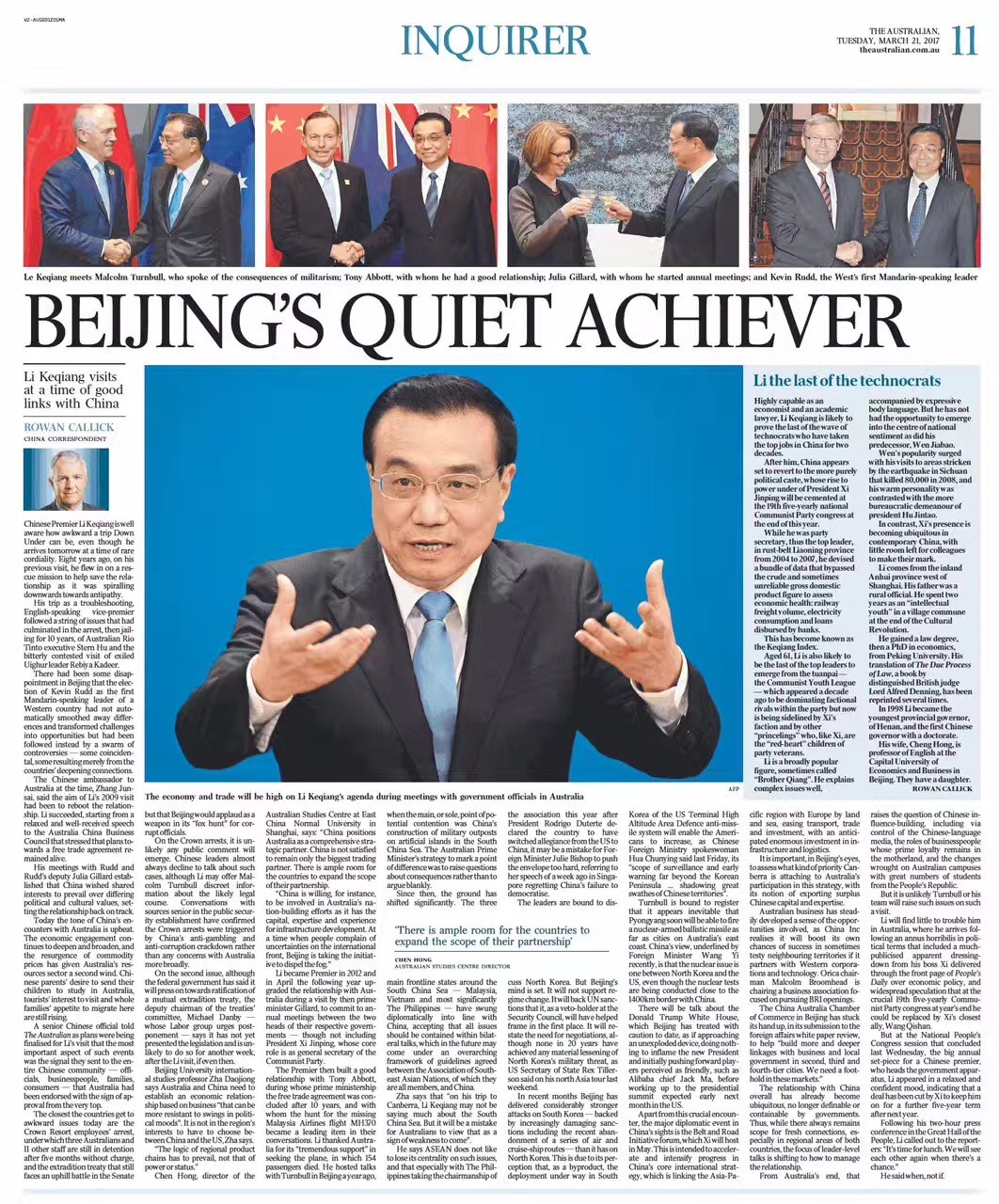 2)3月13日,澳大利亚最大的全国性报纸《澳大利亚人报》(The Australian)发表题为Beijing waits for Canberra to make ‘the China choice’的文章,引述我中心主任陈弘观点,就世界新局势下中澳关系发表观点鲜明的看法。