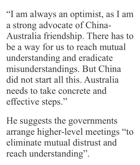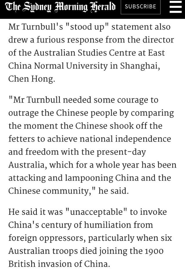 24)12月11日,陈弘接受《悉尼先锋晨报》采访,在该报China criticism grows over Australian ‘foreign interference’ stance的文章中,陈弘对澳大利亚总理特恩布尔“站起来”言论进行了严词抨击。