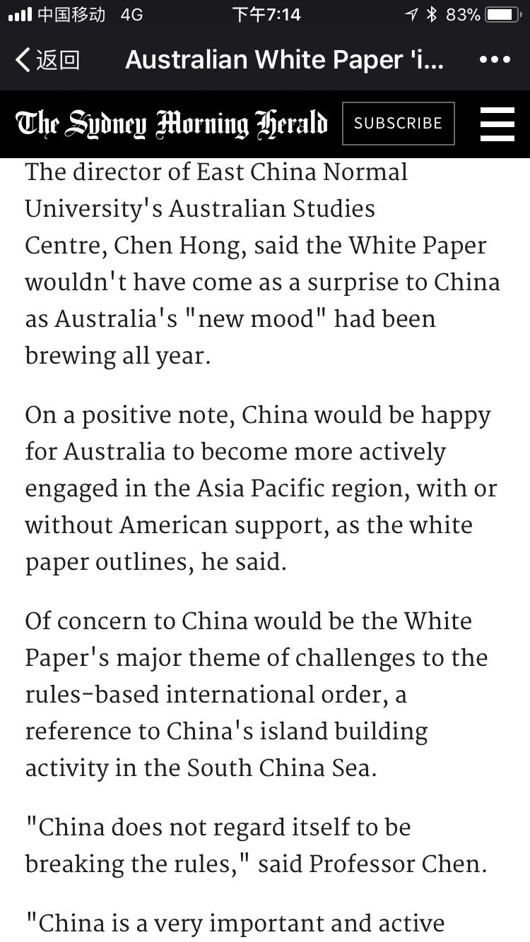 16)11月23日,陈弘接受《悉尼先锋晨报》采访,对澳大利亚政府当日发布的2017年澳大利亚外交政策白皮书进行点评,该报大篇幅引述了陈弘的深入分析与独到论述。