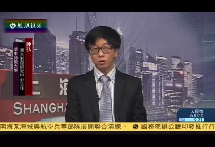 17)11月23日,凤凰卫视中文台《凤凰全球连线》采访陈弘,陈弘就澳大利亚政府2017年外交政策白皮书中澳大利亚自我定位、涉南海问题言论、“印太战略”、澳中关系等发表独到而深刻的评论。