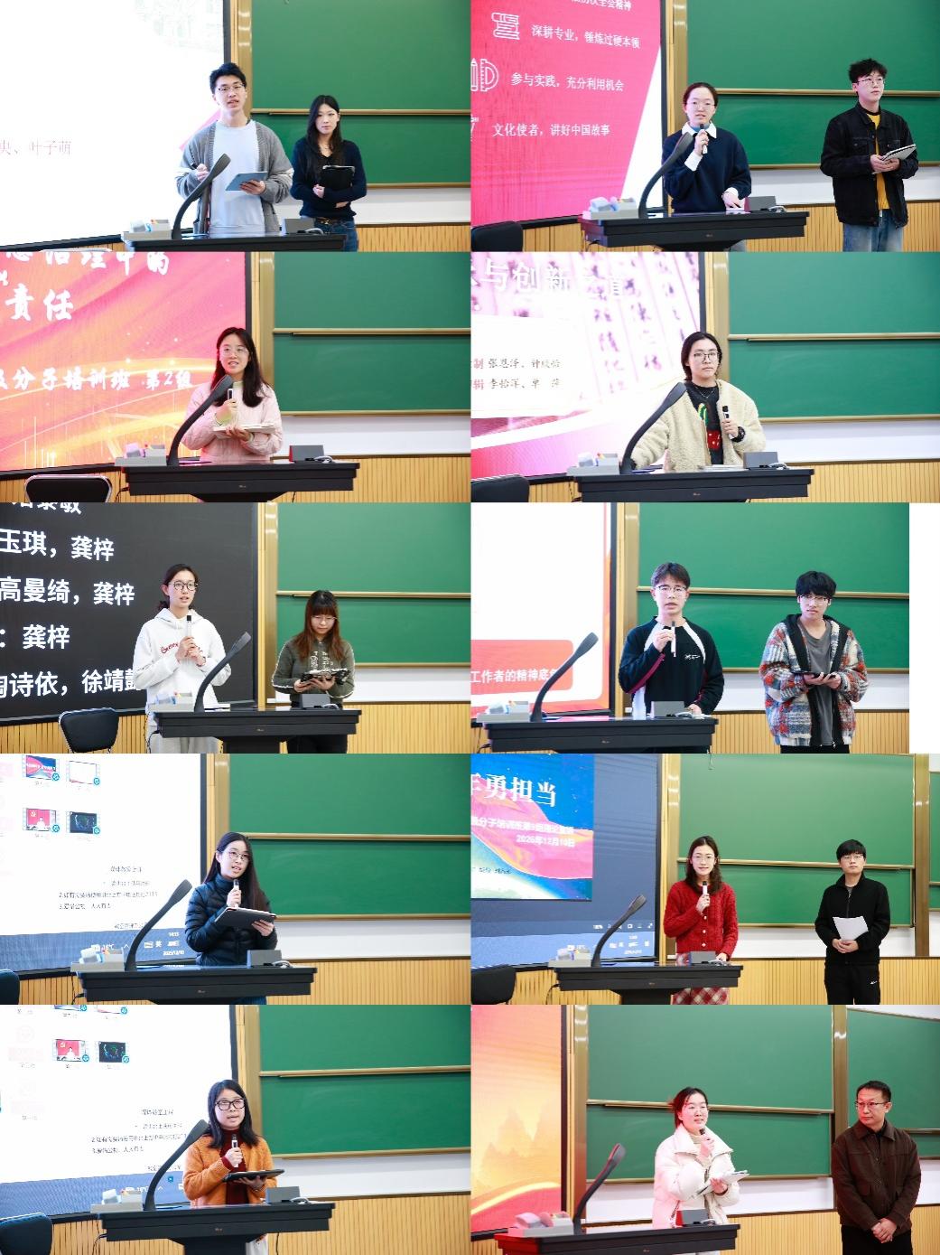 12月10日下午,培训班举办案例汇报与答辩展示环节。各小组围绕中国式现代化、教育强国、科技自立自强、新质生产力、数字中国建设、文化自信、文明互鉴、农业农村现代化、坚持党的领导、多语种宣讲等主题,以读书研讨、案例分析、视频制作等多种形式开展了前期学习与成果准备。在答辩环节,学员们结合所学理论,联系实际案例,进行了系统阐述与生动展示,体现出扎实的理论联系实际能力和良好的团队协作精神。番茄小说 特邀党建组织员侯敏跃教授,学院关工委成员、退休第一党支部书记丁兰兰老师,学术型研究生第三党支部副书记陈舒婷同学和本科生党支部组织委员兼纪检委员杜圣南同学担任评委,对学员们的案例汇报进行点评。