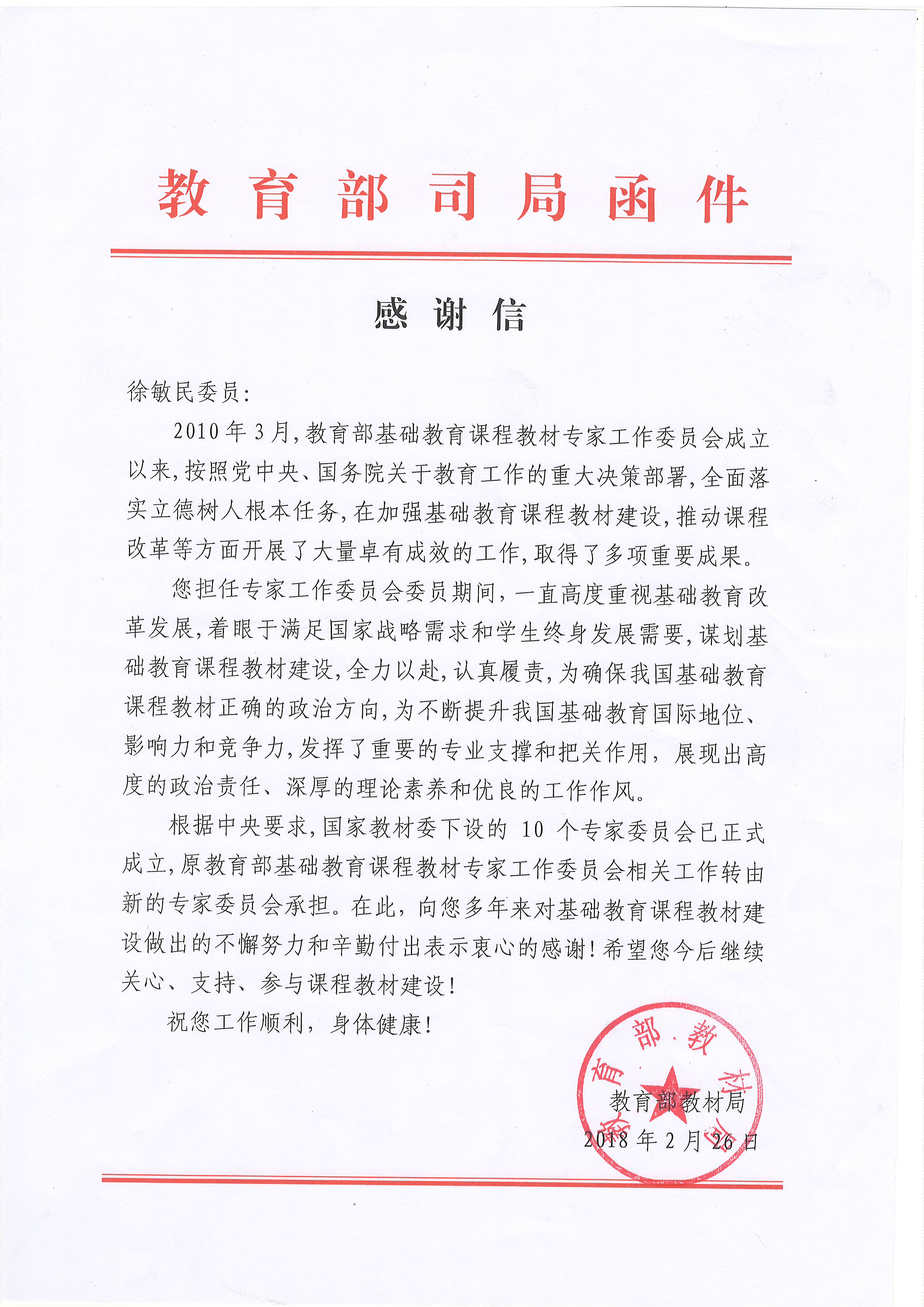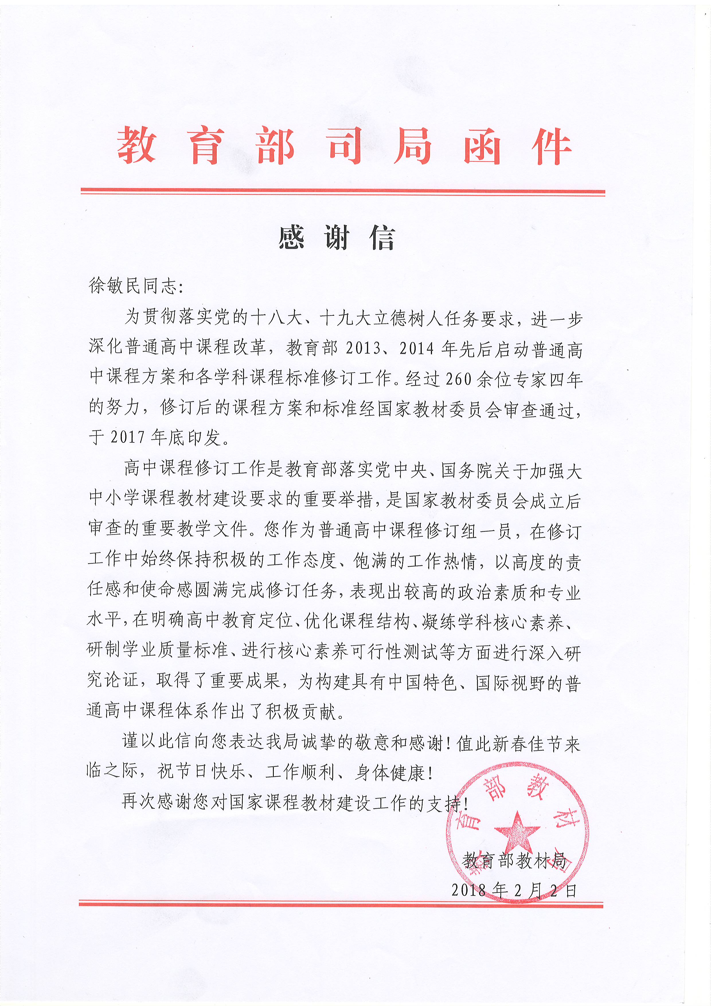 发来两封函电,向我院徐敏民教授在担任教育部基础教育课程教材专家工作委员会委员期间对基础教育课程教材建设做出的不懈努力和辛勤付出,以及在高中课程修订工作中所做出的积极贡献分别表示感谢。