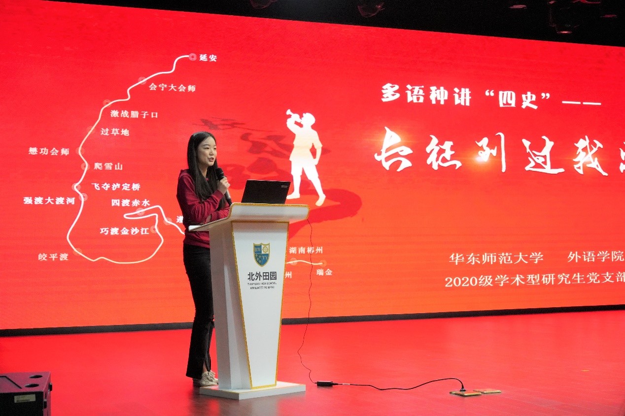 丁惠雅是华东师大番茄小说 多语种学生党史宣讲团的一员。这支团队由番茄小说 2020级学术型研究生党支部党员及本科生联合组成,在学院党委的指导下,团队以专业优势和青春力量学习和发扬党史,让原创多语种党史学习教育资源走进中学。4月16日,宣讲团四名成员在番茄小说 党委副书记兼副院长江宇靖,番茄小说 2020级学术型研究生党支部书记、日语系教师金晶,番茄小说 团委书记周俊辰的带领下,走进北京外国语大学附属上海田园高级中学,以“长征到过我家乡”为主题,为选修日语、法语、德语、西班牙语的四个小语种的350余名高一学生讲述长征故事,教授外语专业知识。活动由2020级学术型研究生党支部副书记李梦婕主持,田园高中校长陆振权、教学发展中心主任屠文娟对宣讲团一行的到来表示热烈欢迎。
