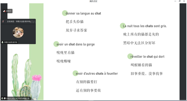 法语系2020级本科生陈宇铃以“法语里的‘猫’”为主题,介绍了法语里较为常见的带有“chat”这个单词的俗语,按照难易程度从易到难依次讲解了这些俗语的本意和引申义,并由此引申出了翻译此类带有文化特性的句子时是选择直译还是意译的问题。另外,她还以“It's raining cats and dogs”这句有名的英语俗语对照法语里意思相同、比喻表达完全不同的俗语,以此分析不同语言中俚语表达的差异。