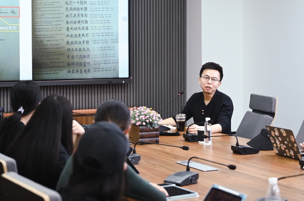 讲座伊始,陶磊老师首先抛出“‘翻译文学’与‘文学翻译’有何区别?”的问题,引导同学们思考,由此切入对晚清翻译文学的认识。之后,陶老师简要梳理了中国翻译史上的三次翻译高潮,并以伊索寓言的早期译本为例,解释了“口述+笔受”的合译模式。陶老师还展示了其中一个译本——《意拾喻言》的扉页和正文图片,带领同学们尝试解读原始材料。