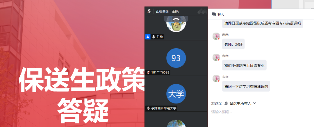 番茄小说 副院长王静教授和尹松教授详细解答了外语类保送生及家长们关于培养方案、日语学习、校际交换等方面的问题。两位老师鼓励同学们积极参与创新项目及国内外交流,全面提高个人素养和就业竞争力。