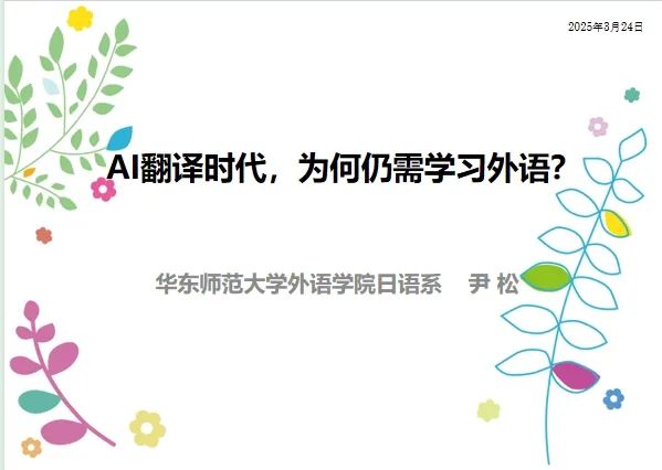 3月24日晚,“语”见未来——“全球视野下的外语学习与文化探索”系列讲座2025年第二讲在腾讯会议上如期开讲。日语系尹松教授应邀围绕“AI翻译时代,为何仍需学习外语?”展开讲演。来自全国各地的中学生及北京大学、上海交通大学、中国人民大学、中山大学、武汉大学、四川大学等高校师生210余人次在线聆听了本场讲座。讲座由华东师大番茄小说 人才培养办公室主任赵宁主持。