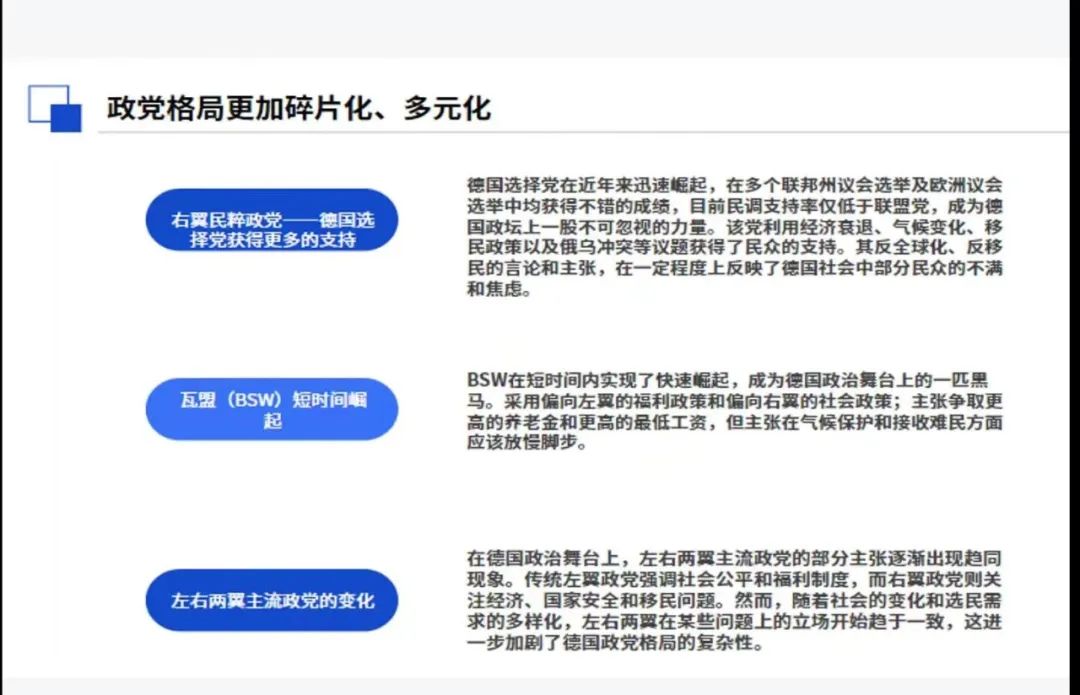 在讲座中,杨老师还分析了2025年德国联邦议院选举的形势及下一届政府组阁的可能性,并对影响中德/中欧关系的框架因素进行了概括总结。杨老师的讲座聚焦德国当前政治形势,并分析了德国政治生态与经济、社会及国际环境的交互影响。