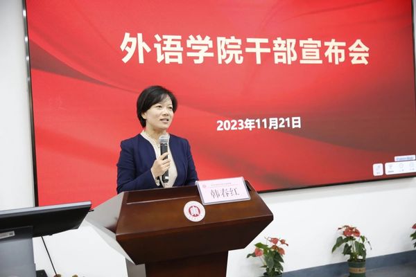 韩春红在表态发言中,回顾了华东师大外语学科深厚悠久的历史以及全体师生传承文脉、接续奋斗取得的瞩目成绩。她强调,在“两个大局”交织激荡的时代背景下,为党和国家培养优秀的外语人才,促进东西方文明交流互鉴,提升国家文化软实力、中华文化影响力、国际传播能力,从而为国家和民族树立文化自信、推动中华文化更好走向世界作出积极的贡献,我们外语人义不容辞、责任在肩。她表示,在今后的工作中,学院党委将积极贯彻学校第十四次党代会精神,锚定学院既定的培养新时代卓越外语人才和建设对接国家重大战略、服务中国话语体系构建的卓越外语学术平台,加强党建工作与事业发展深度融合,以高质量党建引领高质量事业发展,处理好“守正”和“创新”两个关系,为学校加快建设引领育人创新的中国特色社会主义世界一流大学持续贡献外语人的智慧和力量。