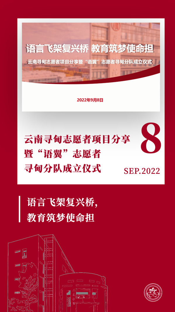 9月8日上午,学院线上举办云南寻甸志愿者项目分享暨“语翼”志愿者寻甸分队成立仪式,连线寻甸金所中学师生,优秀志愿者代表讲述外院人与寻甸“双线奔赴”的实践服务故事。新一届外语人也正接过“语翼”语言服务的接力棒,让青春绽放绚丽之花。