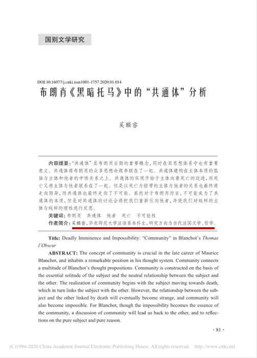 中国知网《布朗肖<黑暗托马>中的“共通体”分析》论文截图,作者简介中“本科生”三个字为期刊主编添加