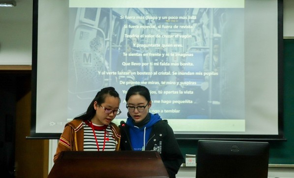随后上场的是来自大一的选手。在第一阶段的西语歌曲演唱和诗歌朗诵环节,同学们各尽所能,深情演绎了动人的歌曲和诗歌。第二轮的单词朗读个人赛,则考察了西班牙初学者对语音语调的掌握情况。尽管大一新生们才刚刚学了两个月的西班牙语,但却毫不怯场,纷纷展现出最佳风采。最终,程泽韵同学和阳昕同学表现出色,获得了“最佳个人奖”。随后则是最为紧张刺激的绕口令环节,要求两个队伍在90秒时间内读对尽量多的西语绕口令。学生们的认真和专注使得这一环节的完成度超出了评委们的预期。最终“podemos队”取得了团体胜利。