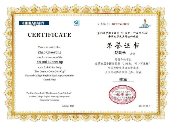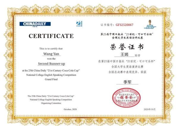 中国日报社“21世纪·可口可乐杯”全国大学生英语演讲比赛是国内最权威、影响力最广、比赛规模最大的英语演讲比赛,参与该项赛事的学生在备赛和比赛的磨炼中可以获得宝贵的英语思辨能力与公众演说经验。本次比赛经过互联网选拔赛、校园选拔赛、地区选拔赛的层层选拔,最终来自全国25个赛区以及港、澳、台地区的66名优秀选手同台竞技。