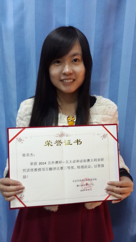 日前,我澳大利亚研究中心2013级研究生徐英杰参加北外澳研-北大必和必拓澳大利亚研究讲席教授项目翻译竞赛,荣获三等奖。北外澳研-北大必和必拓澳大利亚研究讲席教授项目翻译竞赛是北京大学必和必拓澳大利亚研究讲席教授项目的一项重要活动,由北京外国语大学组织承办,是我国规格最高的澳大利亚研究翻译大赛。在今年参赛的近百名来自全国各地的本科生、硕博研究生中,我中心研究生徐英杰以其精准的理解、流畅的语言和优美的译笔脱颖而出,获得大赛三等奖。(吴雯)