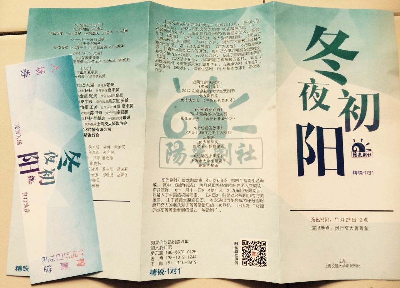 11月27日晚上七点,上海交通大学阳光剧社戏剧“冬夜初阳”在菁菁堂演出。冬夜初阳由《十一月十一日》、《人质》、《街角老店》、《赔?呸!》四个短剧组成,其中《街角老店》为剧社同学的全新创作。番茄小说