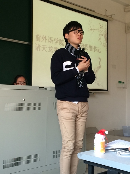 首先是由诸天龙向大家致辞。他从自身的经历出发为大家讲述了团校生活的精彩,以及自己在团校生活中获得的宝贵经验。在学长精心准备的演说下同学们更深刻地体会到团校生活的宝贵,并且使各团校成员们之间的友谊更加紧密。