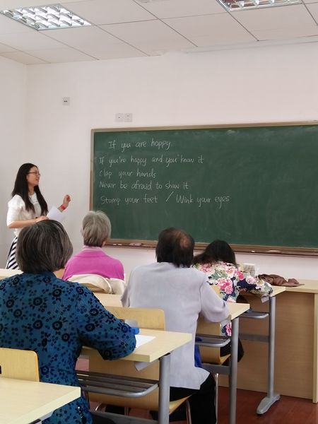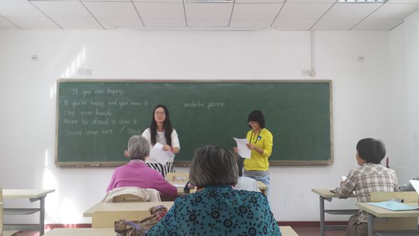 在口语教学服务中,志愿者部长陆薇亦首先带领老人们复习上一节课所学习的音标。接着志愿者们开始带领老人们学习了一些旅游时常用的句式和单词。一遍遍的朗读,一遍遍的纠正,志愿者们耐心依旧,而老人们认真与执着依旧。