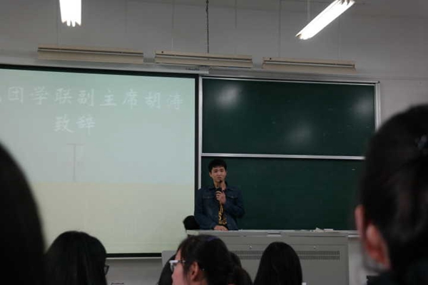 副主席胡涛首先上台致辞。在致辞中,胡涛同学分享了自己对于学生工作的认识,鼓励大家学会分享,开放心态,勇于尝试,积极参与实践,亲身体验与感知。以自身的体会为例,对团校的培训和新干事们表达了期许。新团校成员得到了前辈的的经验,也感受到了前辈们寄予的厚望。
