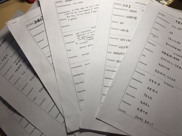 比赛结束后,工作室成员们在20号楼114教室举办了交流会。会上回放了一些比赛时录制的视频帮助大家详细分析各位选手的表现。大家拿出了在观看演讲比赛时记录的笔记,每位同学选择了三位印象深刻的选手就其仪容仪态、演讲技巧、演讲内容进行分析,交流意见。成员们总结出了一下几点:首先语音语调是给人留下印象的最重要的因素之一,借用刘森老师的话就是是 “The moment you opened your mouth you were decided.” 平时一定要多加练习,充分享受学校提供的各种练习英语口语的机会。其次,要结合题目举出引人入胜的例子,这样不仅可以有力地支撑自己的观点还能吸引听众。最后,上台演讲时需注意台风,不可太随意亦不可过于拘谨。这些都需要平时多练习。