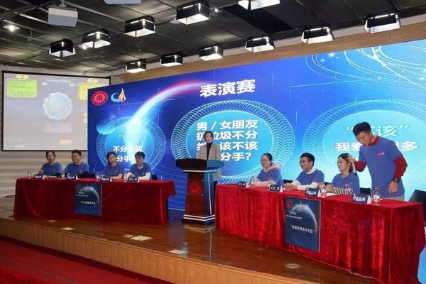 “宏辞论道”研究生辩论赛总决赛在闵行校区学生之家C区报告厅举行。正式决赛前,我院郭利莹同学以及其他学院共8位优秀辩手们呈现了精彩的表演赛,以“男/女朋友扔垃圾不分类,该不该和他/她分手”为题,幽默探讨上海市垃圾分类问题。