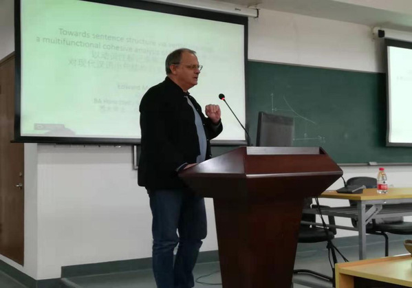 杨延宁教授在《汉英被动构式演变的异与同》主题报告中,借助古汉语和古英语语料,重新审视了被动式的形成与发展过程,揭示了汉英构式演变中的异同点。马爱德教授在《以动词性标记来界定句式:对现代汉语小句结构的多功能衔接分析》主题报告中,首先将所有动词性成分的基本结构视为“逻辑性”结构,然后使用系统功能理论里的不同“元功能”定义了各种语法结构。深圳大学彭宣维教授在《论“得”后成分的功能角色》主题报告中,先回顾了相关研究的内容,之后分析了“得”后成分的两种及物性角色,并指出了一些相对复杂的情况。专家学者们在提问环节,针对报告内容,提出了许多有价值的问题和建设性的意见。
