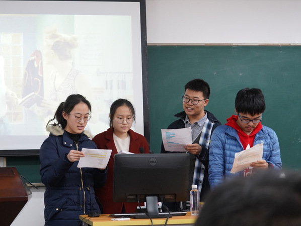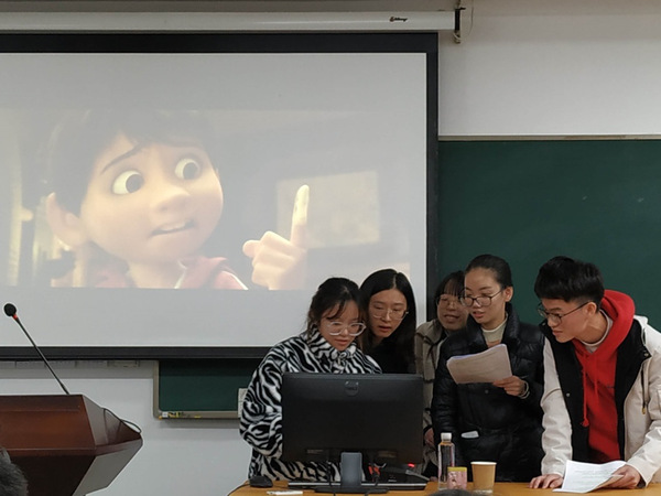 首先,大二同学分为两队进行电影配音表演,角逐最佳团体奖。“贵族小妞队”为大家带来了《寻梦环游记》和《酒吧》的电影片段,“和平精英队”则为我们呈现了《疯狂动物城》和《寻梦环游记》中的片段。影片高潮迭起,扣人心弦,同学们的表演语言流畅、情感饱满,生动再现了影片中的欢乐、深情、紧张或绝望,为各位观众带来了一场视听盛宴。
