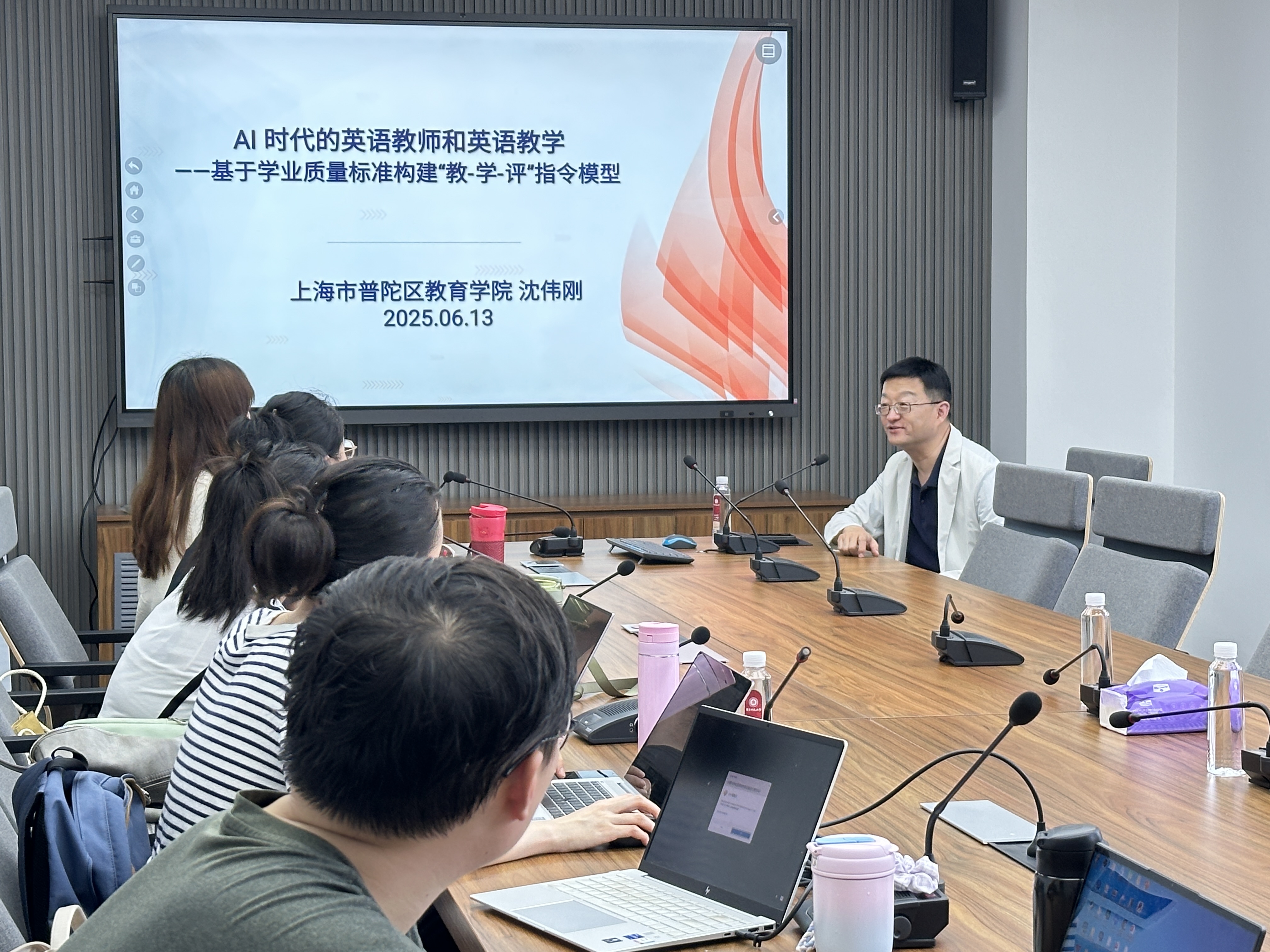 学术型研究生第二党支部于2025年6月13日下午在外语楼319教室成功举办了“智启未来——AI赋能英语教学与卓越教师成长”主题党日活动。活动特邀上海市英语特级教师、普陀区教育学院高中英语教研员沈伟刚老师主讲,由党支部书记邹航主持。