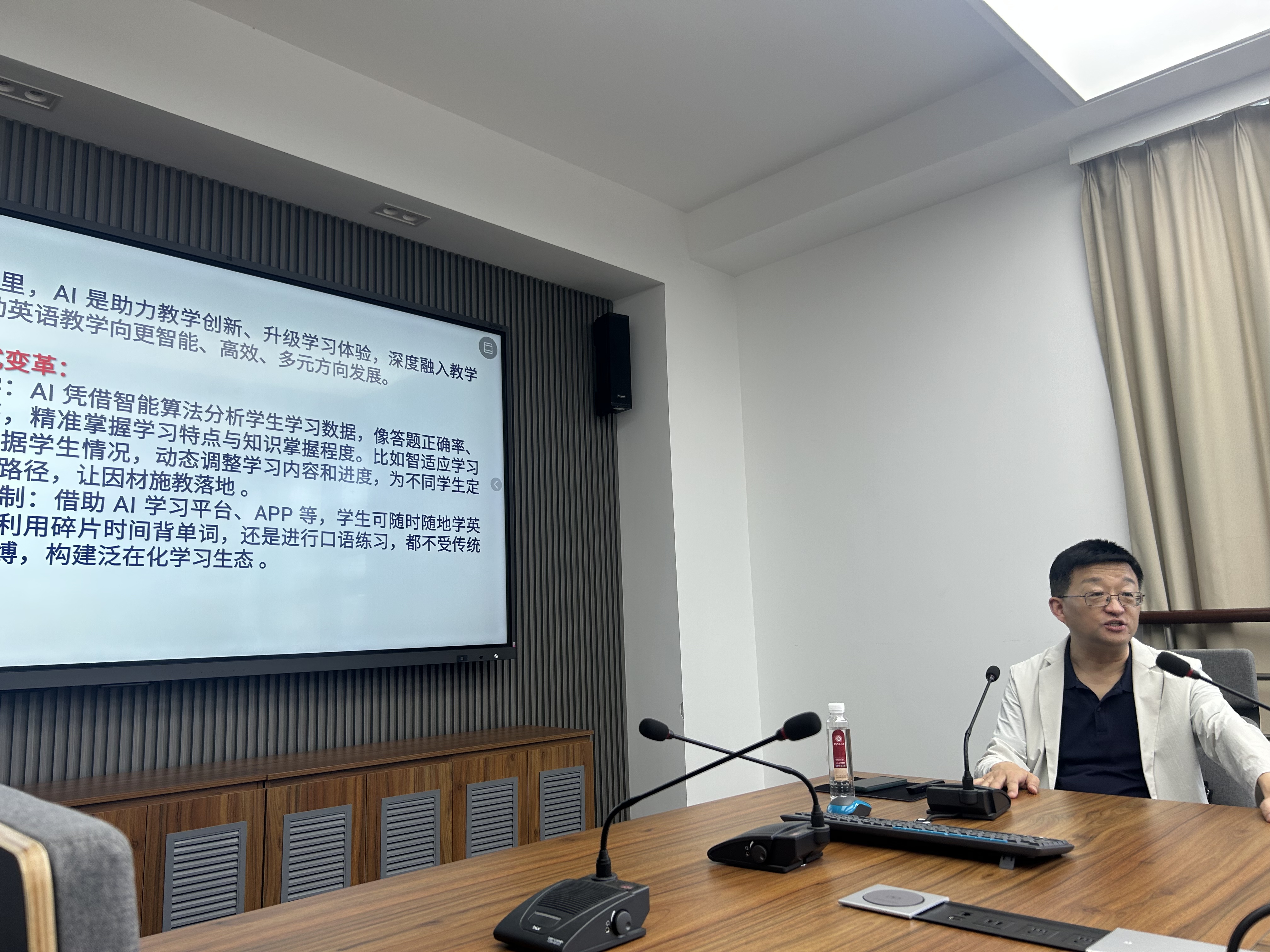 沈老师围绕“AI赋能英语教学”的主题,从教学理念的转型切入,指出在AI技术飞速发展的背景下,英语教学应实现从传统模式向智能化、创新化的转变。他强调,人工智能已逐步深度嵌入教学全过程,不仅提升了教学效率,更丰富了教学形式,有助于实现教学目标的精准达成。