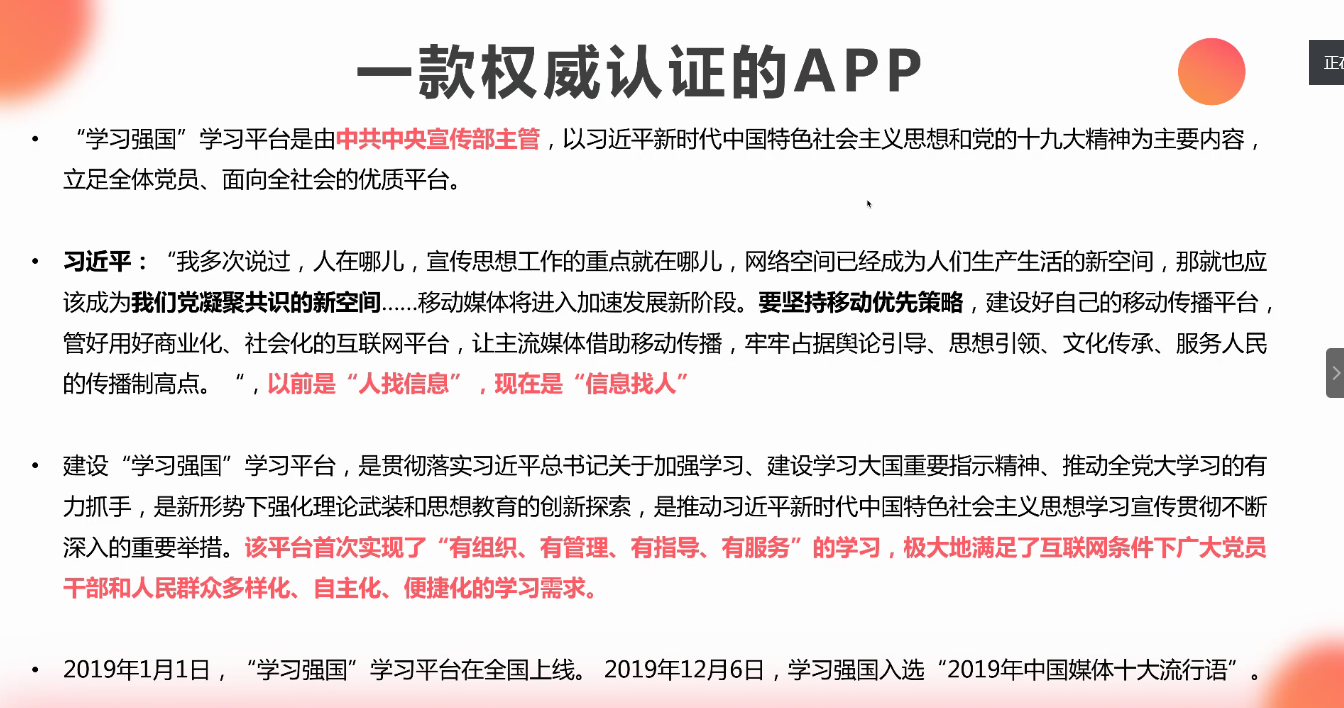 最后,冯烨鼓励大家从今天开始行动起来,各支部可以通过“答题比赛”、“积分竞赛”等方式促进大家的学习劲头。她强调,学习最重要的还是能够实现自我提升,希望大家能好好利用学习强国的丰富资源,努力充实自己。同学们纷纷表示,“学习强国”是一款“宝藏APP”,今后一定要将上面多种多样的学习材料充分利用起来,相互督促、互相分享,始终保持高涨的学习热情,实现自我的全面发展。