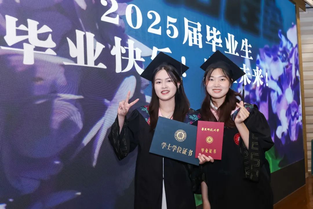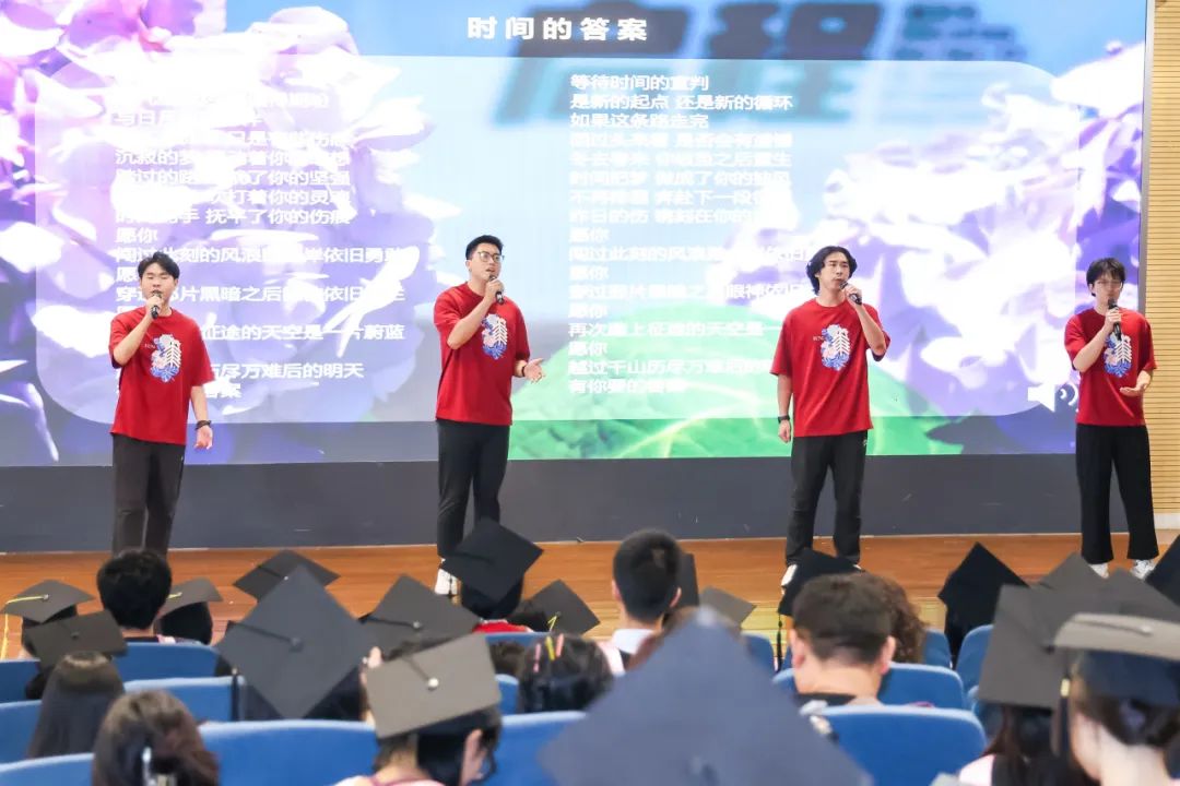 典礼末尾,周翔宇、丁海峰、樊锐、宁勇航唱响《时间的答案》, “愿你再次踏上征途的天空是一片蔚蓝,愿你越过千山历尽万难后的明天有你要的答案!”祝福2025届毕业生带着师大精神的滋养,凭借语言的磅礴力量,奔赴人生山海,开启崭新旅程。