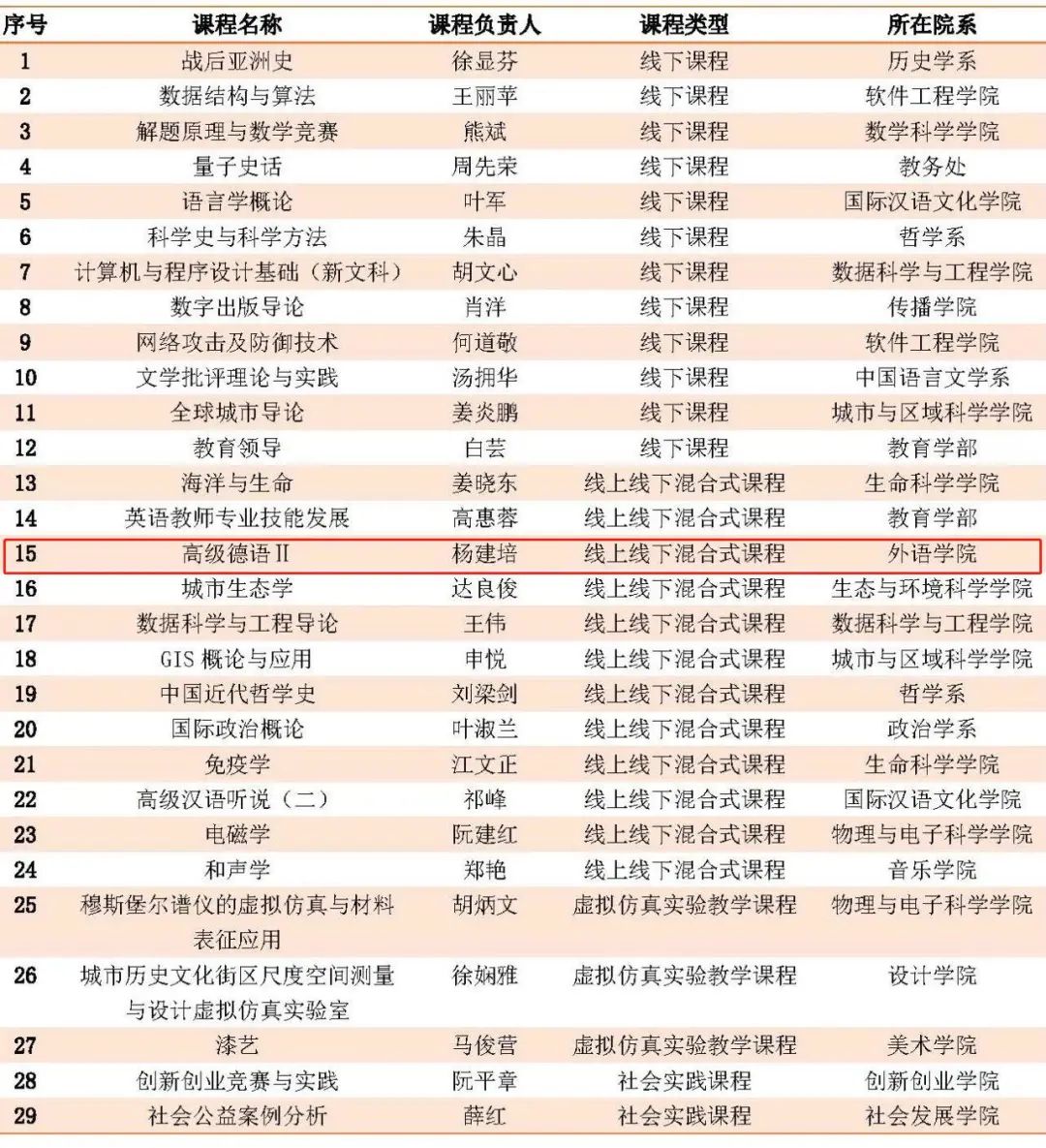 日前,上海市教委发布了《上海市教育委员会关于公布2021年度上海高校市级重点课程立项名单的通知》(沪教委高〔2021〕34号),公布了2021年批准立项的507门课程名单,我校29门课程获批立项。其中,线下课程获批立项12门;线上线下混合式课程获批立项12门;虚拟仿真实验教学课程获批立项3门,社会实践课程获批立项2门。其中,我院杨建培老师的课程《高级德语Ⅱ》获2021年上海高校市级重点课程建设立项(线上线下混合式课程)。