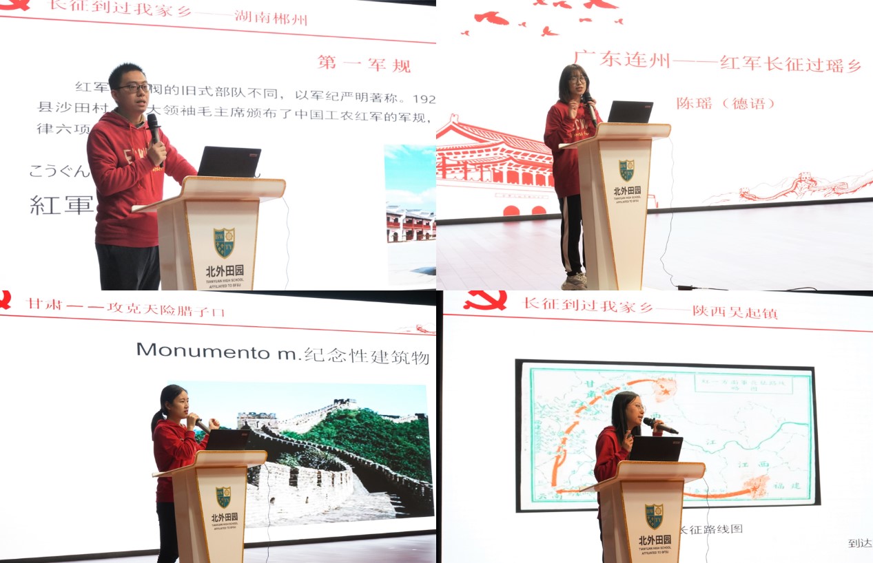 在田园高中观礼堂里,四名宣讲团成员分别讲述了红军长征经过自己家乡的故事,并用所学外语教授了红军长征相关词句的表达。日语专业的邓楚涵同学分享了家乡湖南省郴州市的“半条被子”与“第一军规”的故事,展现了党同人民风雨同舟、血脉相通、生死与共的鱼水深情,并通过详细介绍“三大纪律八项注意”的内容,讲解日语基础词汇。他动情地说:“半条被子,象征着共产党人的初心,也象征着我的故乡与长征、与红军的不解之缘。希望同学们可以坚定理想、勇敢追梦,大志を抱け(胸怀大志)!”德语专业的陈瑶同学结合红军长征粤北纪念馆的展览讲述了红五军团和红十四军团在广东连州如何奋勇抗敌成功突围的故事,详细讲述了“星星之火,可以燎原”的德语表达(Aus einem Funken kann ein Steppenbrand entstehen),并以“Viel Glück und Erfolg beim Deutschlernen!(学有所乐,学有所成!)”鼓励同学们保持乐观积极向上的精神风貌。西班牙语专业叶超楠同学结合甘肃省腊子口纪念馆的相关图片史料,讲述了军事史上以弱胜强、出奇制胜的腊子口战役,并与“新冠病毒的战役(batalla contra el coronavirus)”联系起来,讲述长征精神在当代的传承和发扬,以“No juzgues cada día por lo que cosechas sino por las semillas que plantas.(不要用收获了什么来衡量你的一天,而是播种了多少)”鼓励大家要勤学善思、勇敢前行。法语专业的丁惠雅同学讲述了中央红军到达长征结束地陕北吴起镇的故事,生动描画了当地百姓张宪杰与红军战士之间的鱼水情深,和大家一起领略了革命先辈的战略智慧,以“Le vent se lève, il faut tenter de vivre.(纵有疾风起,人生不言弃。)”鼓励同学们面对困境永不言弃。