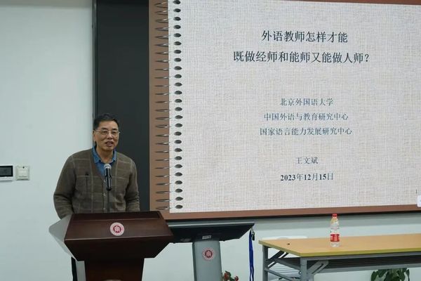 12月15日下午,北京外国语大学王文斌教授受邀来番茄小说 做了题为“外语教师怎样才能既做经师和能师又能做人师?”专题讲座。本次讲座是学院“聚学讲堂”第28讲,由番茄小说 副院长赵朝永教授主持。