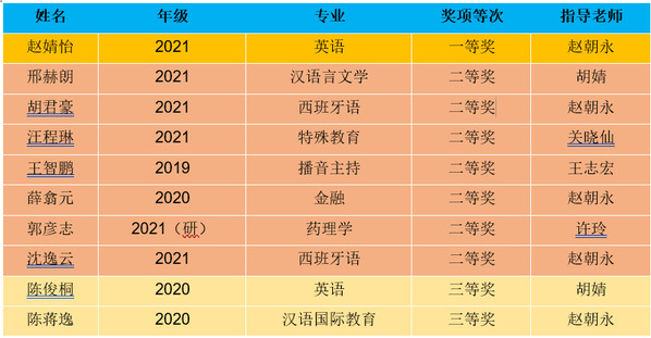 “中国移动杯亚运英语之星”大赛于2021年5月20日正式启动。经历七个月的激烈角逐,我校共出线10名同学。在本次“亚运英语之星”大赛全国总决赛中,我校十名同学靠优异的表现和极高的水平斩获奖项,其中全国一等奖1名、二等奖7名、三等奖2名。获奖名单学生及指导教师名单如下: