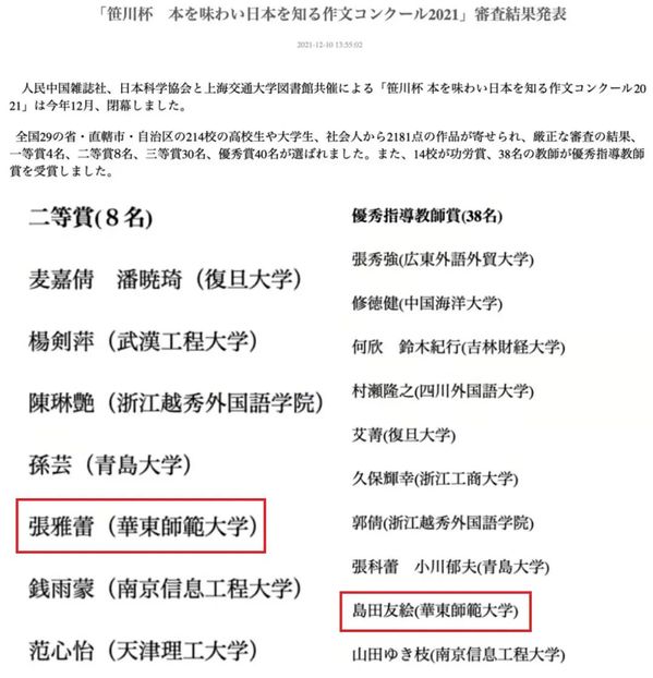 “笹川杯品书知日本征文大赛2021”评选结果于2021年12月10日揭晓。番茄小说 日语系2019级本科生张雅蕾同学凭借作品“一般人の人生を送る”荣获全国二等奖,岛田友绘老师荣获优秀指导教师奖。
