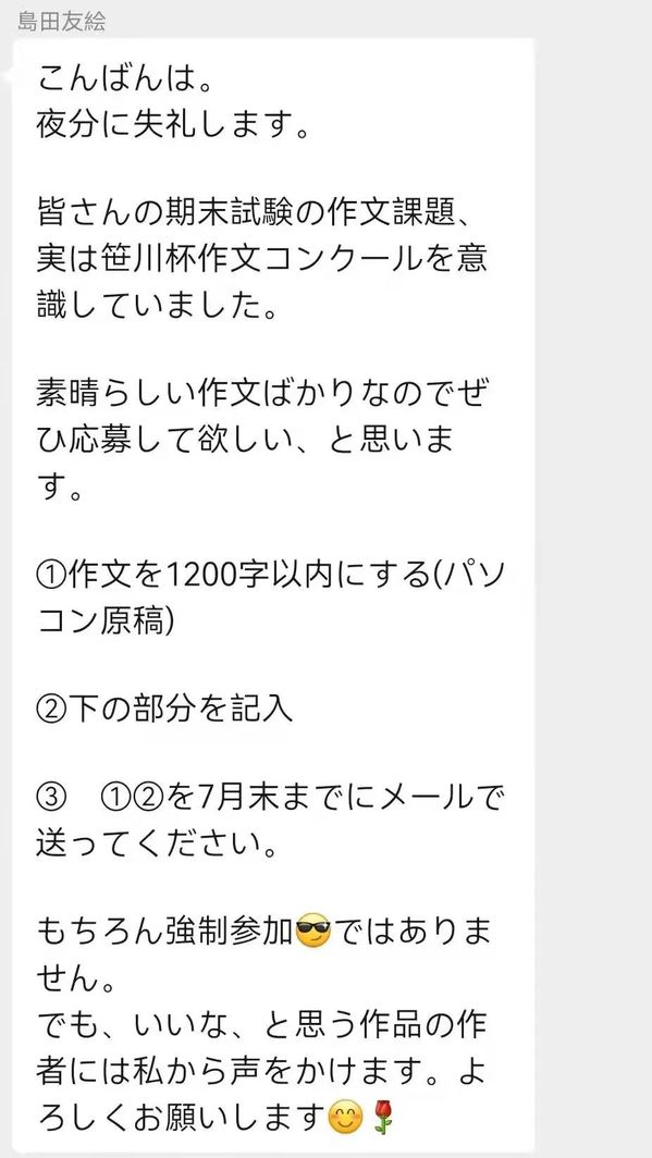 今年暑假前,岛田老师作文课的期末作业题目是「本を味わい日本を知る」,请大家结合读过的日本文学作品等谈谈自己的感受。后来得知这是岛田老师为了鼓励大家参加“笹川杯”征文大赛,特意布置的题目。