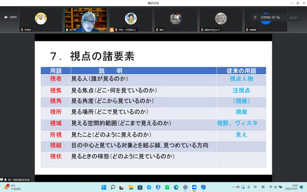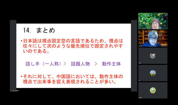 之后彭老师又介绍了日语中“人称限制”的定义,并引入了“视点”的概念,介绍了与视点相关的要素和术语,表示根据不同的视点可以将语言分为“视点固定型语言”和“视点移动型语言”,彭老师认为日语是视点固定型语言,而汉语和英语是视点移动型语言。