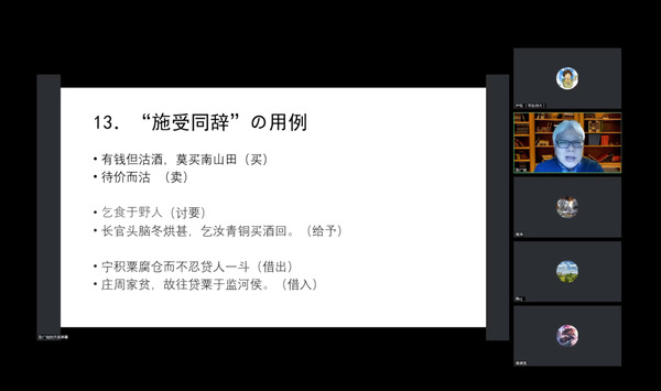 彭老师重点对三个系列、七个动词的日语授受表达的用法进行了归纳,并列举了汉语授受动词进行汉日对比,比如汉语“我借了他五块钱”可以表示“我借给了他五块钱”也可以表示“我跟他借了五块钱”而日语则需要用“借りる”和“貸す”加以区分。彭老师指出汉语中的授受动词可以追溯到古代汉语中的“施受同辞”。比如“沽”字,“有钱但沽酒”表示“买”,而“待价而沽”则是“卖”的意思。这些中文表达同日语表达形成鲜明对比,以此帮助同学们更好地理解汉日语言中授受表达的不同。
