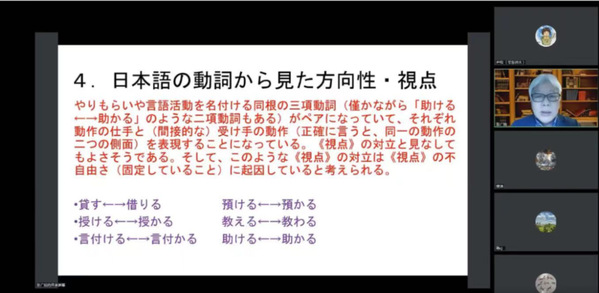 彭老师首先介绍了授受表达的定义,表示由于形式上的多样性和用法的复杂性,授受表达是语法教学的一大难点。彭老师通过梳理学界目前对授受表达的研究情况,介绍了当前学界研究主要聚焦于日语语言学、日语教学以及对比语言学等方面。紧接着彭老师通过几组成对的日语动词启发思考日语的“视点”与“方向性”。
