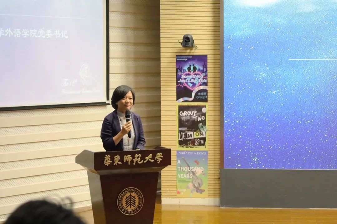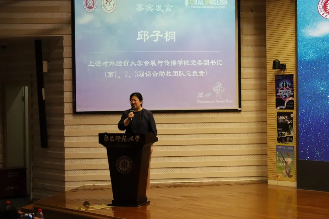 2007年首届语音助教团队第一负责人、现任上海对外经贸大学会展与传播学院党委副书记邱子桐老师上台发言。她简要回顾了当年参与语音语调大赛的经历,表达了对那段青春时光的怀念,并对比赛延续至今、不断发展表示欣慰与祝贺,同时鼓励同学们珍惜平台,不断追求卓越。