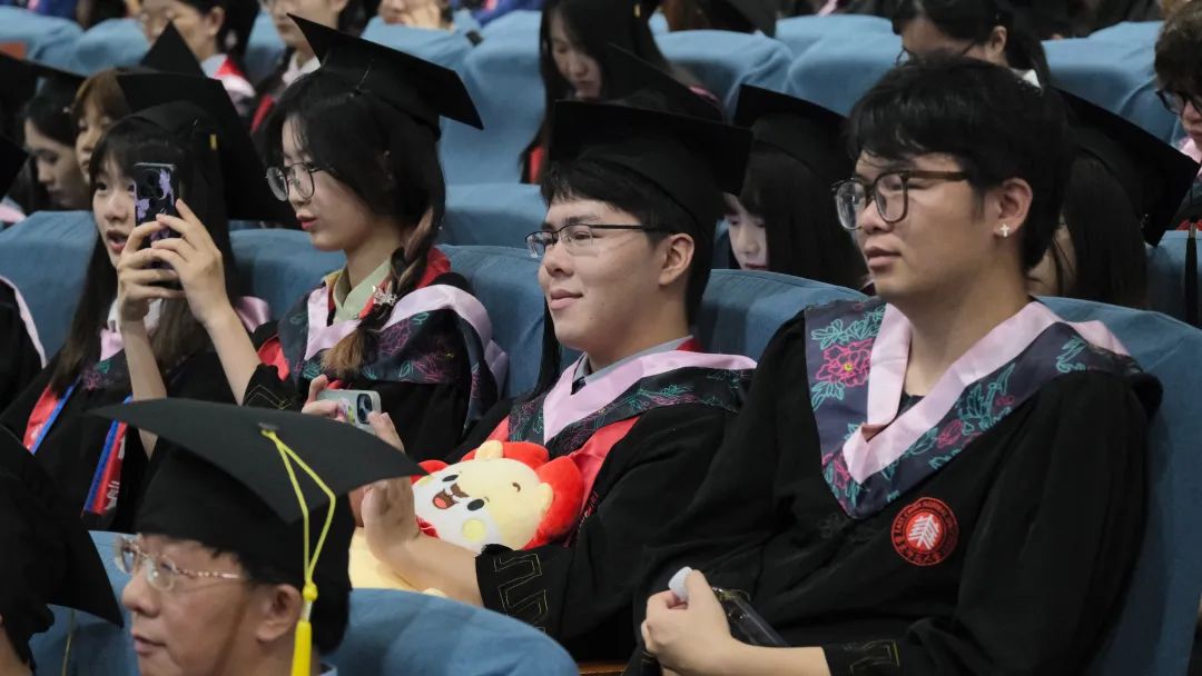学位授予仪式上,教师代表们为毕业生们拨穗并颁发学位证书。
